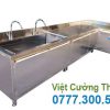 Hệ tủ được làm từ inox 304, không gỉ, dễ dàng vệ sinh. Hệ tủ là sự kết hợp của bồn rửa và tủ có gáy. Bên trong tủ có nhiều ngăn rộng rãi, giúp không gian xung quanh trở nên gọn gàng.