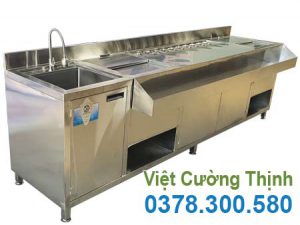 - Kết cấu gồm 02 bồn rửa, thùng đá, kệ trên,…